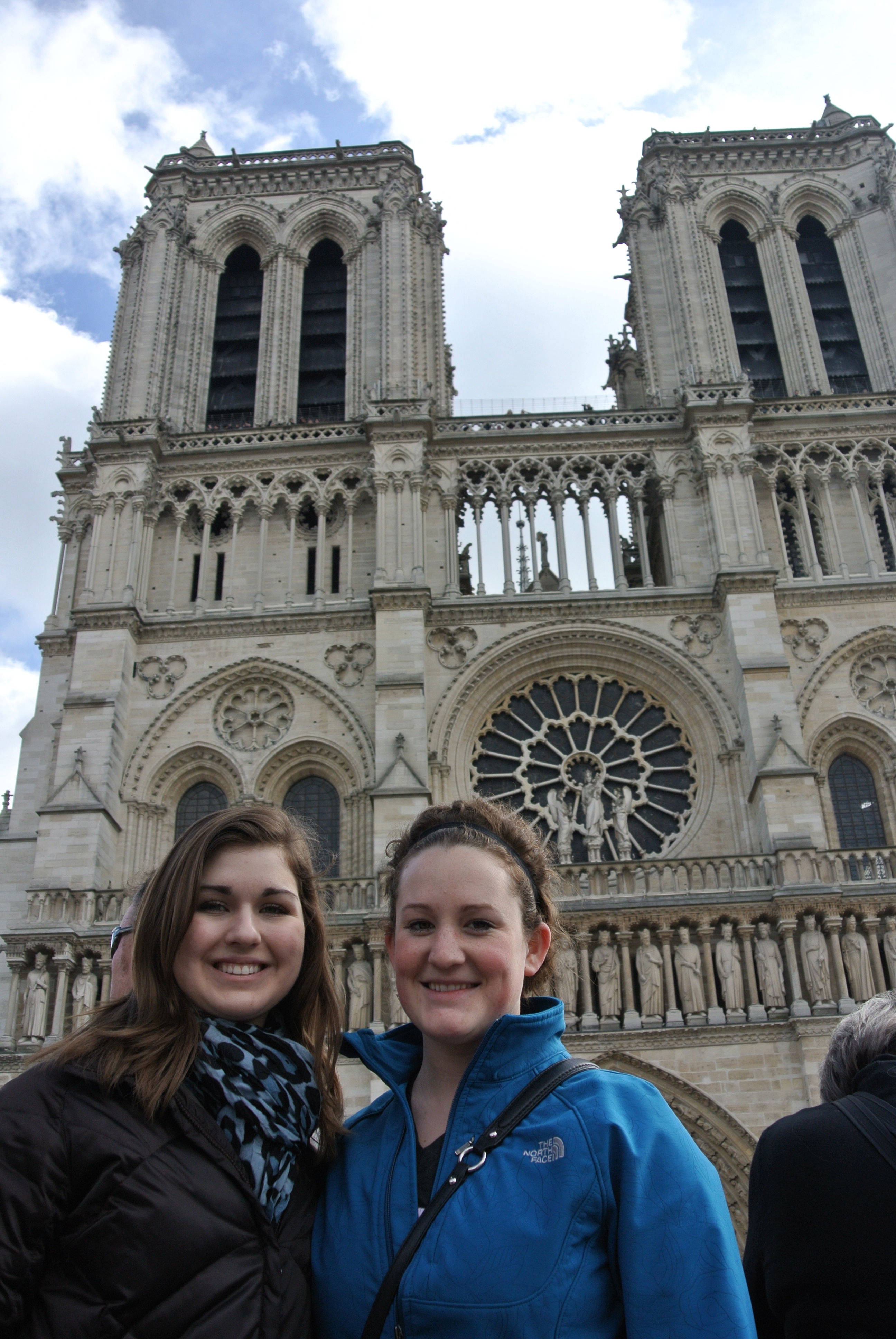 Saturday morning, we woke up pretty early so we could catch the train from Orleans to Paris (it’s about an hour train-ride). Ella and I had a big list of things we wanted to see, but were completely unaware as to how big that city actually is. Before we saw anything, we stopped for coffe and a little food. Ella and I shared this cheese thing, which I can’t remember what it’s called, which was cheese, but yogurty… very French. And very delicious! Then we made our way to Notre Dame (can you believe I saw Notre Dame?!?!?) It was beautiful, and this year was an anniversary of the building, so they had a huge viewing thing set up so more people can see it from higher up and such. We did not go inside, because the line was so long and we wanted to see other things., but the outside was stunning – it is just amazing to me that ‘a bunch of guys with hand tools could build all this.’ (name that movie) The stonework was just all so intricate!